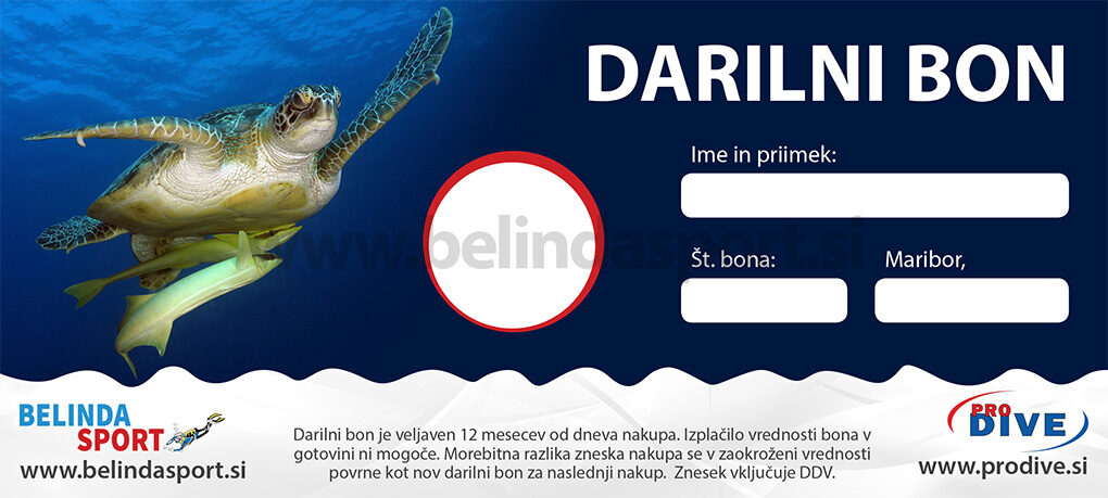 V trgovini Belinda Sport za vas pripravimo lepo oblikovan darilni bon za nakup v trgovini v vrednosti 10, 20, 50, 100 eur (zneske lahko združujete) ali kot bon za celoten potapljaški tečaj katerekoli stopnje po programu potapljaškega kluba Pro Dive.